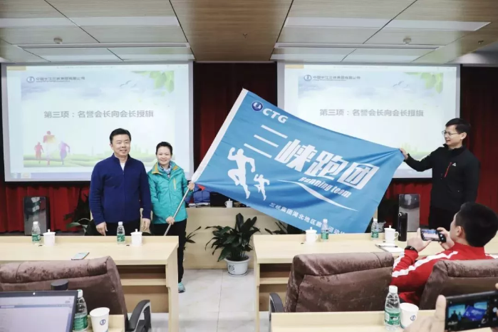 名誉会长陈国庆分别向协会会长、副会长授“三峡跑团”“长江电力跑团”队旗,宣布协会正式成立。这标志着跑团从此有了自己的名字,跑友们有了自己的社团。
