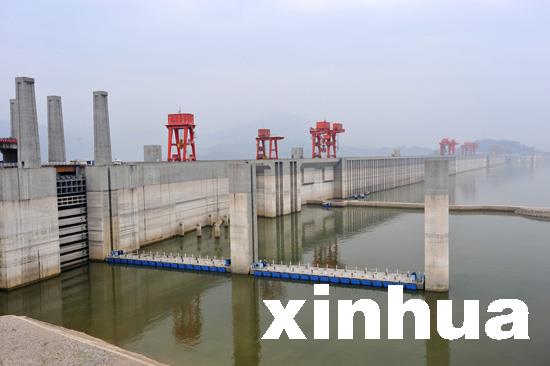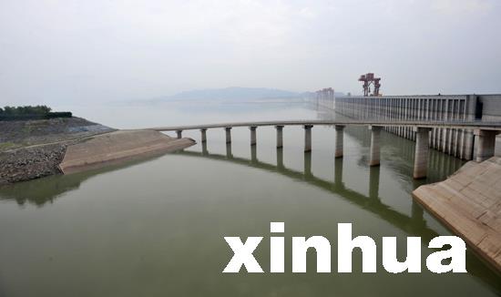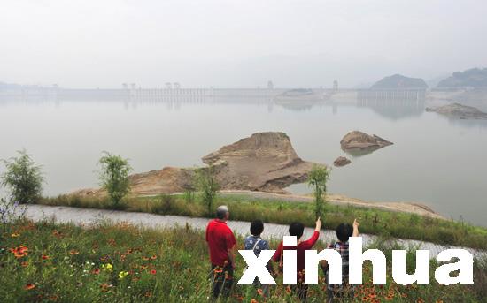 6月10日,几位游客在三峡坝前观看水位下降后三峡大坝。郑家裕 摄
