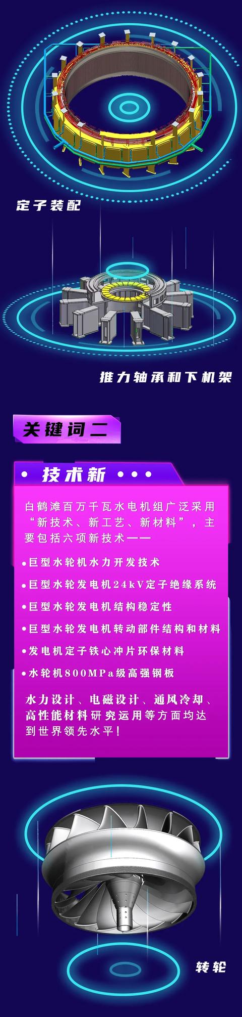 转子是水轮发电机组的重要转动部件。机组运行时,转子转动产生旋转磁场,切割定子绕组,从而产生感应电势、输出电能。白鹤滩水电站左岸机组转子外圆直径约16.2米,最大高度约4.1米,起吊重量达2100吨,是机组安装过程中重量最大的核心部件。