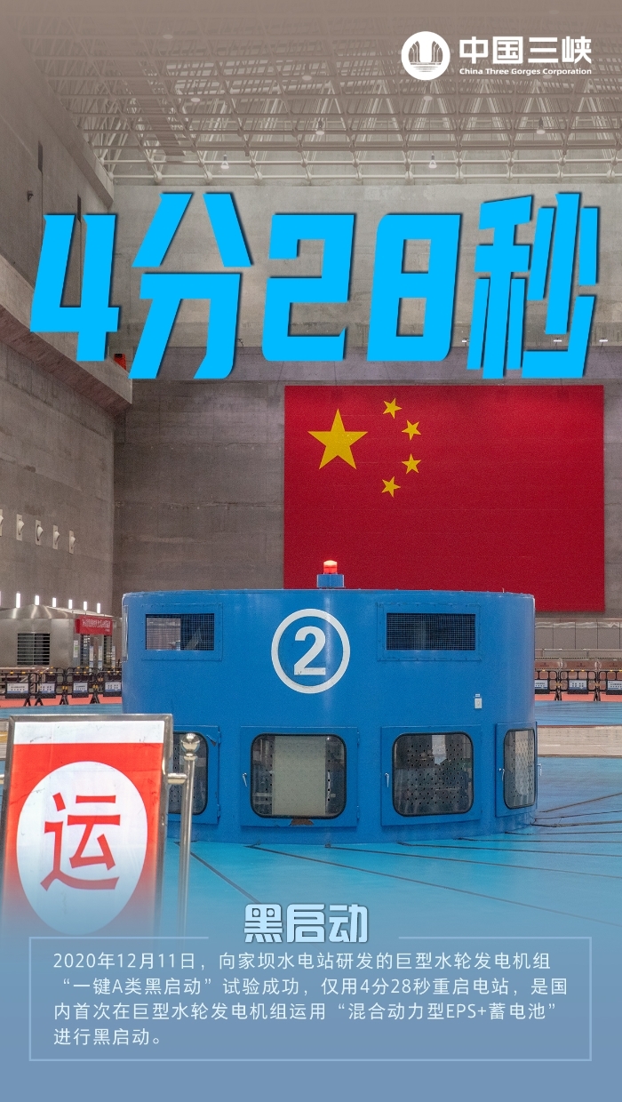 “4分28秒,可以重启一座巨型电站!”2020年12月11日,向家坝电厂潜心研发的巨型水轮发电机组“一键A类黑启动”试验成功,这是世界首次在巨型水轮发电机组运用“混合动力型EPS+蓄电池”进行黑启动。在全厂停电情况下,仅用4分28秒就自行恢复厂用电,并具备了协助电网恢复的能力,创造了世界巨型水轮发电机组最短黑启动时间纪录。