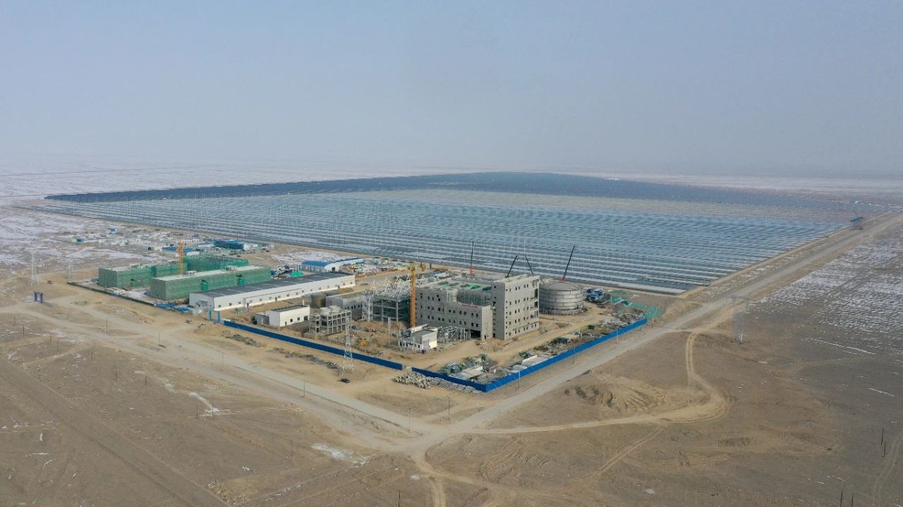 ▲在新疆哈密的茫茫戈壁上,10万千瓦“线性菲涅尔”光热储能电站和90万千瓦光伏电站毗邻而建。其中光伏电站已于2024年年底并网发电,光热储能电站也进入到设备安装的关键阶段。
