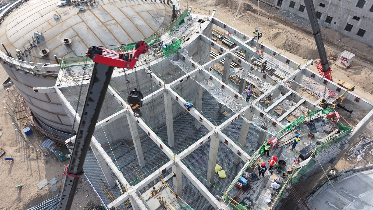▲建设中的光热储能电站熔盐罐