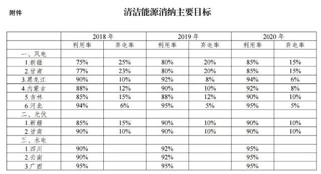 具体指标:2018年,确保全国平均风电利用率高于 88%(力争 达到 90%以上),弃风率低于 12%(力争控制在 10%以内);光伏发 电利用率高于 95%,弃光率低于 5%,确保弃风、弃光电量比 2017 年进一步下降。全国水能利用率 95%以上。全国大部分核电实现安 全保障性消纳。