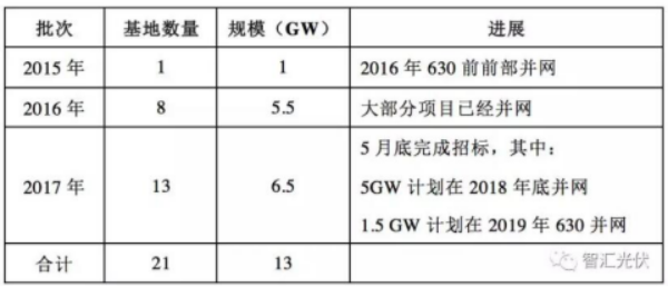 2017年11月,国家能源局下发《关于公布2017年光伏发电领跑基地名单及落实有关要求的通知》,确定2017年光伏发电应用领跑基地和技术领跑基地名单,共10个应用领跑基地和3个技术领跑基地,每个基地的规模均为50万kW。