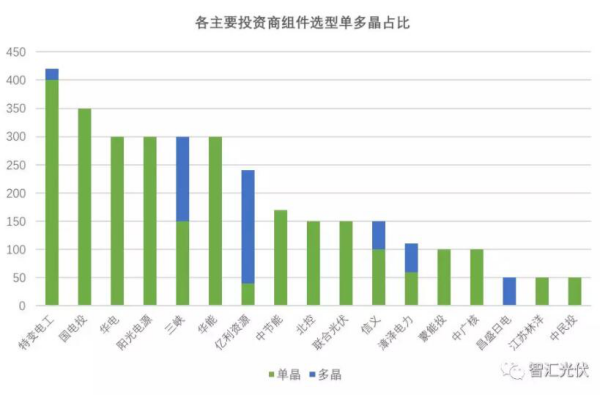 从上图看出,在多晶组件中,270W的60片多晶电池组件用量最多;单晶组件中,280W的60片单晶电池组件用量最多。可见,大多数多晶组件刚满足领跑者效率指标,而单晶组件中超越领跑者效率的比例相对更多。