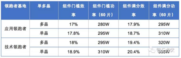 2017年应用领跑基地采用的多晶硅电池组件和单晶硅电池组件的光电转换效率应分别达到17%和17.8%以上;技术领跑基地采用的多晶硅电池组件和单晶硅电池组件的光电转换效率应分别达到18%和18.9%以上。