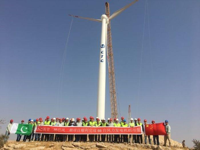 本网讯(李杰)2月3日上午10时,随着风机叶轮在85米高空与发电机完美对接,巴基斯坦风电二期项目最后一台风机整机吊装工作顺利完成,标志着历时140天的风机吊装攻坚战取得圆满胜利,为后续风机现场验收试验及并网发电奠定了坚实基础。