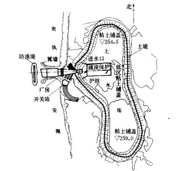 上水库围堤长9.6km,堤顶高程290.00m,最大堤高52m,内外边坡坡度均为1:2.5。填筑土方2880万m3。土堤的迎水面用沥青混凝土护面,面积60万m2。