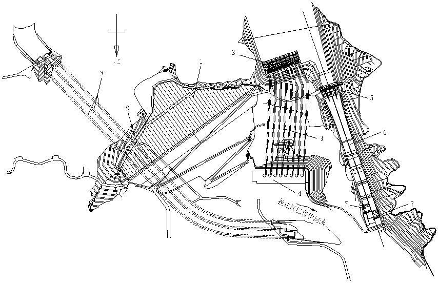 引水发电系统 主厂房为地面厂房,位于左岸,引水发电系统采用一机一洞布置方式。发电洞内径均为8.5m,衬砌厚度一般为70cm。压力洞最后约200m采用钢衬,内径7.0m。单机额定引用流量为208m3/s,设8台容量为300MW的混流式水轮机,设计水头174.8m。安装间布置在厂房的右侧。