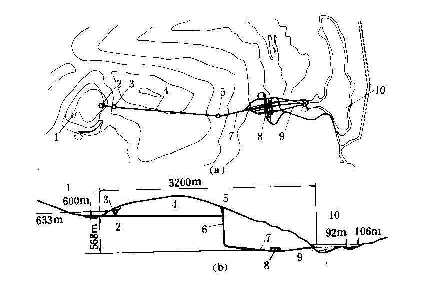 水道系统 1条直径为10.5m、长1695m的低压隧洞引水,然后接入调压井及直径10m的竖井,深412m,最后接直径为9.5m的高压隧洞,长 530m。6条直径3.8m的压力管道,长400m,下端90m用钢板衬砌。尾水洞前段直径4.5m,共6条,后段合成3条,直径8.5m,前后两段共长 520m。