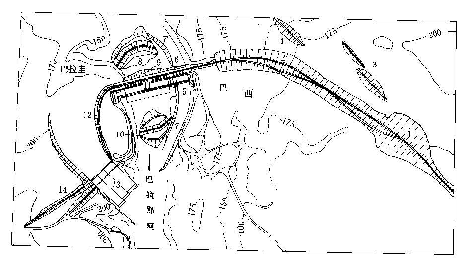 位于南美洲巴拉那河中游巴西与巴拉圭两国的边界河段上,一期装机18台,总容量12600MW,多年平均年发电量750亿kW·h,是20世纪世 界上已建规模最大的水电站。工程由巴西和巴拉圭两国共建,并分享电力。1992年一期18台机组全部投产发电,2006~2007年扩机2台,总装机容量 达14000MW,是当今世界上已建规模第二大的水电站。2012年发电量达到最大,为982.87亿kW·h。向巴西一侧输电电压765kV,向巴拉圭 一侧输电电压500kV。