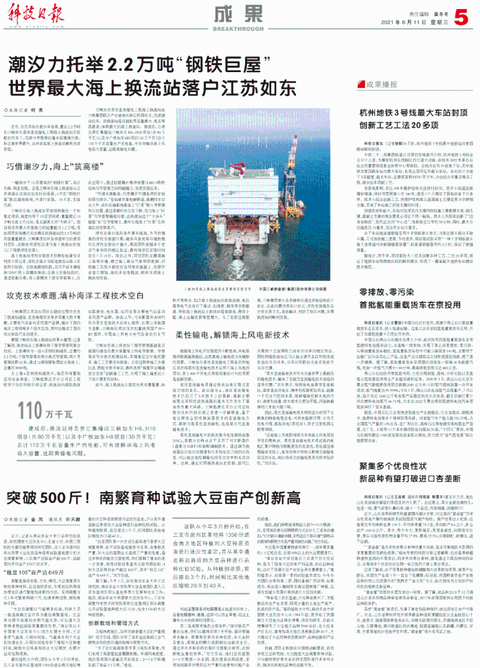 三峡如东柔性直流输电工程海上换流站由三峡集团联合产业链相关单位协同攻关,完成建设任务。该换流站是目前世界容量最大、电压等级最高、体积最大的海上换流站。建成后,它将负责汇集输出三峡如东H6、H10项目(共80万千瓦)以及中广核如东H8项目(30万千瓦)总计110万千瓦容量生产的电能,可有效解决海上风电场大容量、远距离输电问题。