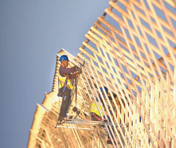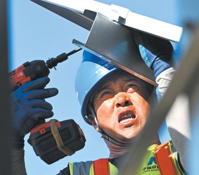 库布其沙漠新能源基地,工人在进行组件螺栓安装作业