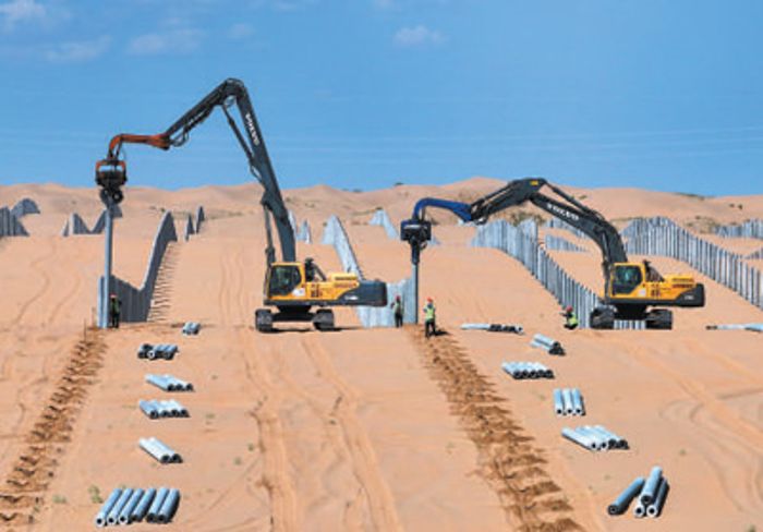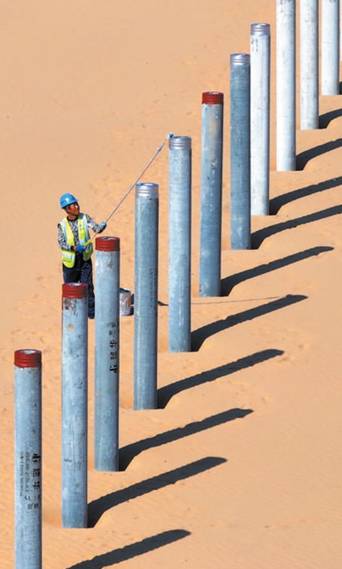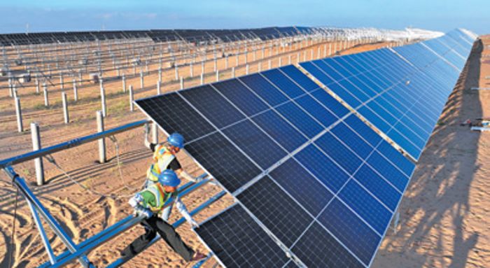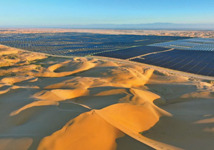 实施“三北”工程是国家重大战略。作为新时代“三北”工程“三大攻坚战”之一,黄河“几字弯”攻坚战是重中之重。在黄河“几字弯”南岸,库布其沙漠横亘绵延,一望无际,细看却有一抹抹醒目的绿色在成片的光伏板和在建的光伏管桩之下。在沙漠建设光伏基地,既能充分利用光照资源发电产生经济效益,又能有效减少土壤水分蒸发、扩大植被覆盖度;同时,通过板下种植和板间养殖,有助于当地农牧民生活水平的提升。