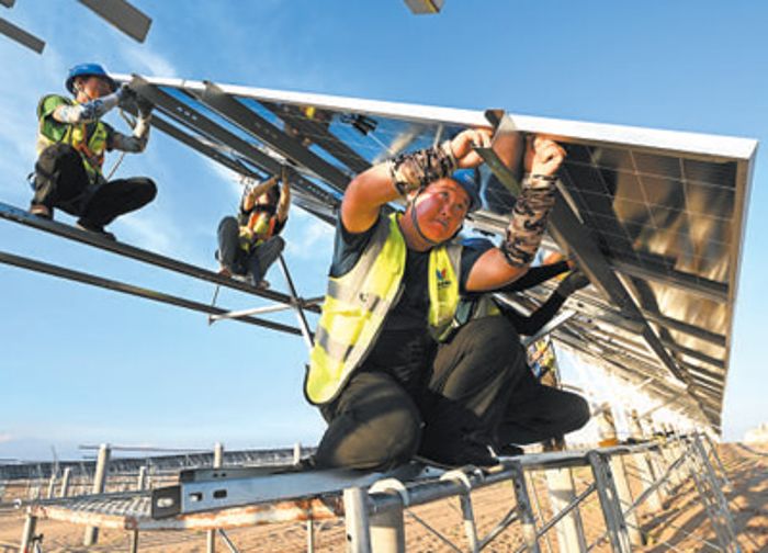 库布其沙漠新能源基地,工人正在进行光伏板安装作业