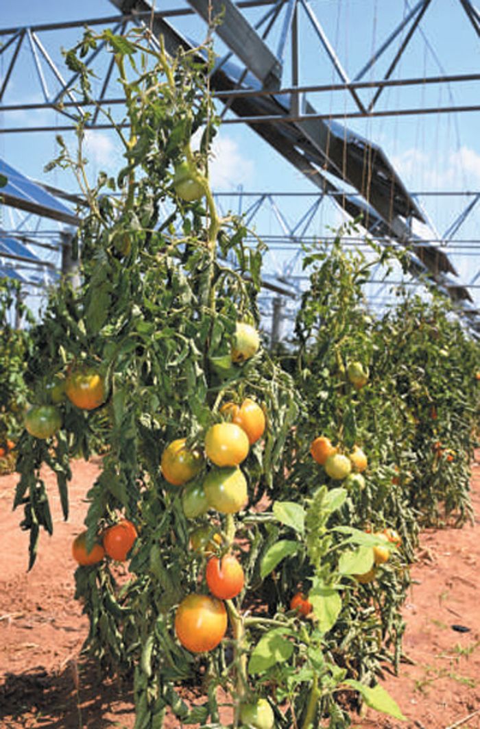 鄂尔多斯市蒙西基地库布其200万千瓦光伏治沙项目采用智能节水灌溉技术,板上发电,板下规模化种植西红柿,长势喜人