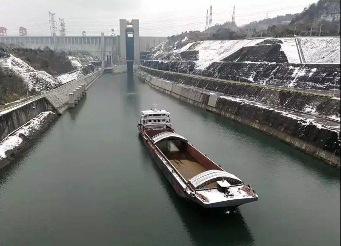 2018年冬季,细碎的雪花洒落人间。严寒之中,披上一层洁白“轻纱”的三峡升船机矗立在江面上,忠诚履行着大国重器的通航职责。 摄影:汤伟