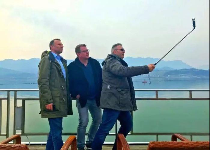 图为几名外籍员工在乘船即将通过三峡升船机时,自拍留影。 摄影:朱静霞