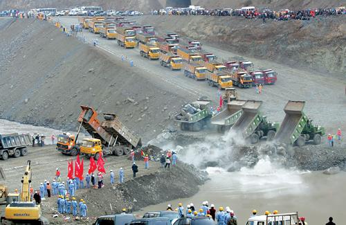 11月8日15时15分,随着中国三峡总公司总经理李永安一声号令,几十台严阵以待、装满混凝土四面体、特大石块和各种规格截流用料的自卸车轮番上阵,开始向水面仅有7米宽的龙口发起抛投总攻。15时40分,龙口胜利合龙。