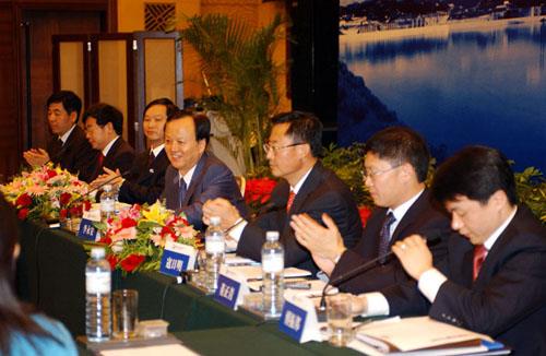 图为中国三峡总公司总经理、长江电力董事长李永安(中),中国三峡总公司副总经理、长江电力总经理毕亚雄(左三)等在媒体见面会上答记者问时的情景。本报通讯员 陈伟 摄