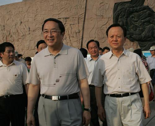 图为中央政治局委员、湖北省委书记俞正声(中)在中国三峡总公司总经理李永安等的陪同下,兴致勃勃地登上坛子岭,考察三峡工程。本报记者 孙荣刚 摄