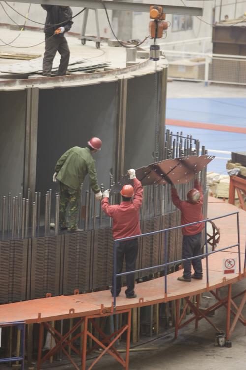 12月26日,几名施工人员正在三峡右岸机组施工现场紧张忙碌,葛洲坝三峡机电安装项目部承担施工的16号机组转子铁片正在有序叠装。
