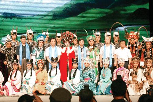 演出结束后,中国三峡总公司党组纪检组组长于文星、内蒙古自治区文化厅副厅长赵新民等与全体演员合影留念。 本报记者 孙荣刚 摄