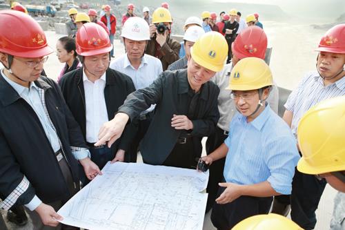 10月16日至19日,中国长江三峡集团公司总经理李永安在副总经理樊启祥、总工程师张超然等陪同下,先后考察了正在建设中的金沙江向家坝、溪洛渡水电站。图为李永安在向家坝二期基坑上游围堰施工现场指导工作。 本报记者 孙荣刚 摄