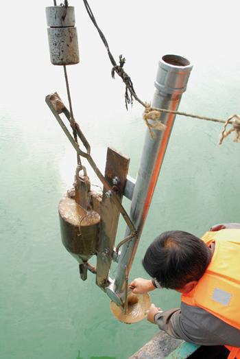 11月3日,长江委三峡水文局河道勘测队员刚刚测完三峡坝前固定断面的水文情况,又开始库区淤积物干容重监测,队员们认真采集水下100多米的江底泥沙样品,为三峡水库泥沙研究收集了宝贵的第一手资料。  本报通讯员 张伟革 摄