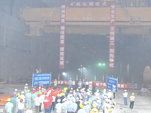 4号机组由土建向机电安装交面后,将进行蜗壳安装,并于2011年2月份实现机电向土建反交面进行蜗壳混凝土浇筑。目前,地下电站厂房施工有序推进,其中1、2号机组正在进行蜗壳混凝土浇筑,3号机组正在进行蜗壳安装。按照计划,地下电站1、2、3、4号机组将于2011年的2、5、9、12月份正式进行机组主体安装。2012年和2013年汛期前,将分别完成2台机组安装并投入运行。