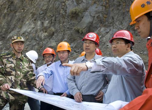| 中国三峡集团副总经理樊启祥(右三)一行赴白鹤滩水电站工地进行现场查勘。(王连生 摄) |