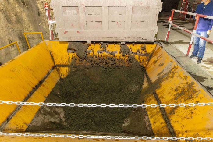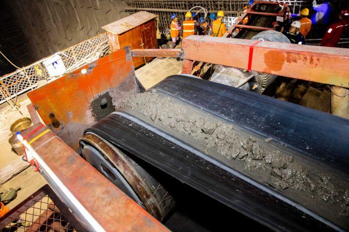 22日中午1点33分,停靠在下料平台的运载车将混凝土倒入运料小车,拉开了龙落尾段首仓混凝土浇筑的帷幕。混凝土经小车输送到120米斜坡下的皮带上,再通过皮带和边墙台车的“接力”,最终抵达浇筑面。这样的流程将在龙落尾段边墙混凝土浇筑过程中不断循环。