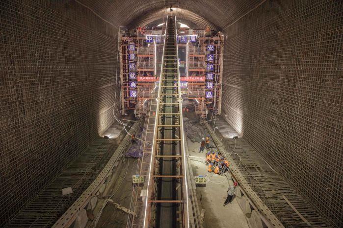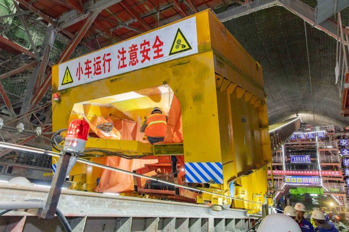 白鹤滩水电站工程泄洪洞水流最大流速达到每秒42米,衬砌混凝土温控和抗冲耐磨要求极高,需采用低塌落度的常态混凝土,传统的泵送方案无法适应龙落尾段高达27度的最大坡度和极其有限的施工通道。为了将混凝土顺利输送到浇筑面,有关单位研制了大坡度重载自动化运料系统,该系统已在11月6日试验成功。据白鹤滩工程建设部泄洪洞项目部表示,这套系统全部由白鹤滩建设者自行设计,在没有经验可借鉴、没有成熟工具可利用的情况下攻克了大坡度环境下常态混凝土运输难题,保证了常态混凝土运输效率和质量,也确保了运输过程的安全。