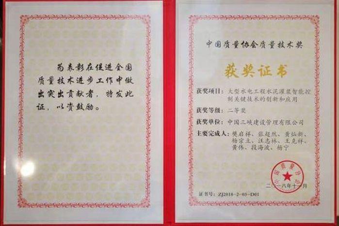 中国三峡建设管理有限公司及合作单位共同完成的研究课题《大型水电工程水泥灌浆智能控制关键技术的创新和应用》获得“2018年度中国质量协会质量技术奖”二等奖;三峡新能源调兵山风电有限公司“风之影”QC小组研究课题《降低金风1.5兆瓦风冷机组变流器故障频次》荣获“首届中央企业QC小组成果发表赛一等奖”。