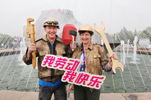 图为一对来自英国的夫妻身着工程建设者服装在坛子岭园区合影留念。