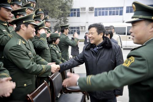 | 元月28日,中国三峡集团总经理陈飞慰问驻守三峡工地的武警官兵。(张爱忠 摄) |