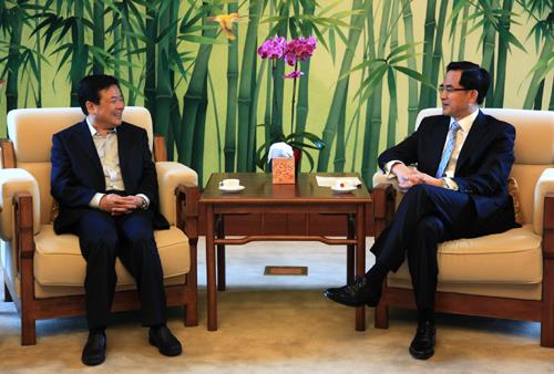 | 9月16日~23日,中国三峡集团总经理陈飞(左)率团访问了中国驻美大使馆,并与中国驻美公使杨子刚(右)会谈。 |