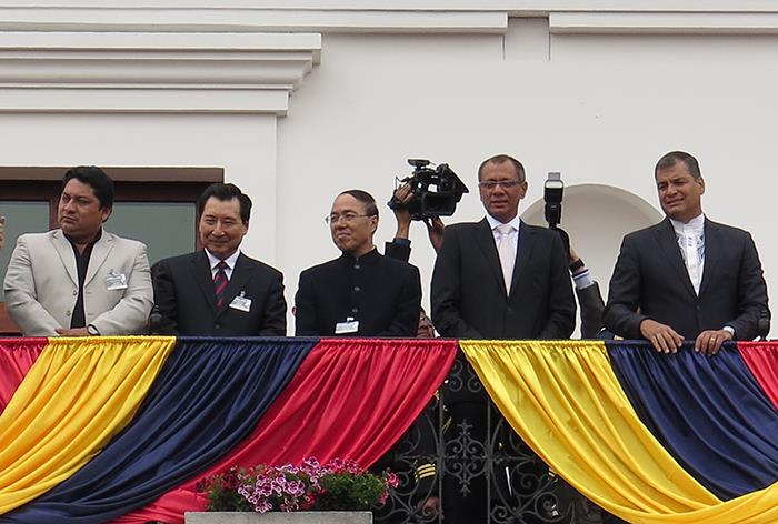 卢纯受邀参加厄瓜多尔总统护卫队换岗仪式。图为卢纯(左二)与厄瓜多尔总统科雷亚(右一)、副总统格拉斯(右二)、中国驻厄瓜多尔大使王士雄(左三)在总统府观看换岗仪式。谢泽 摄