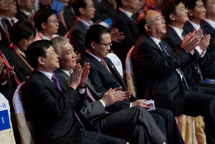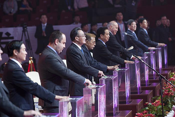 | 中共中央政治局常委、全国人大常委会委员长吴邦国及外国政要出席第十三届中国西部国际博览会开幕式,并共同按下启动按钮。(王连生 摄) |