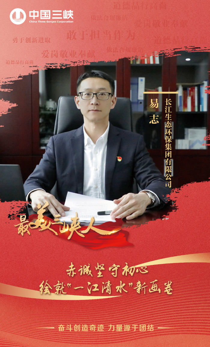 2016年,习近平总书记提出“共抓大保护,不搞大开发”,勾画出了推动长江经济带生态优先、绿色发展的宏伟蓝图。易志主动请缨从大水电转战大保护,顺江而下1000多公里,以水电人钉钉子的精神,安全高效建成九江防汛“第一坝”,化解百川入湖之险;为十里河“扫黑除臭”,帮九江百姓找回“家门口的幸福河”。2021年,易志作为主要负责人带领九江三峡水环境公司荣获全国五一劳动奖状、全国引领性劳动竞赛先进集体称号;江西省委省政府授予易志“生态文明建设先进个人”荣誉称号。