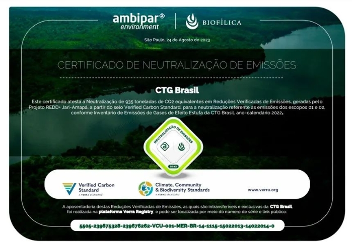 ▲ 三峡巴西公司2022年碳中和证书