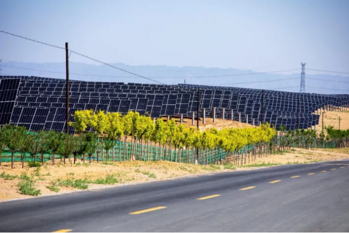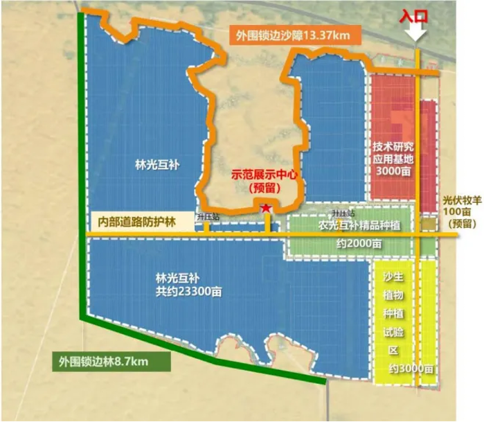 库布其基地项目一期占地3.25万亩,光伏部分于2023年年底并网,生态种植工作于今年3月启动,划分成五个区域:外围锁边林和内部道路防护林、“林光互补”区、“农光互补”区、技术研究应用示范基地、“双碳”公益林。