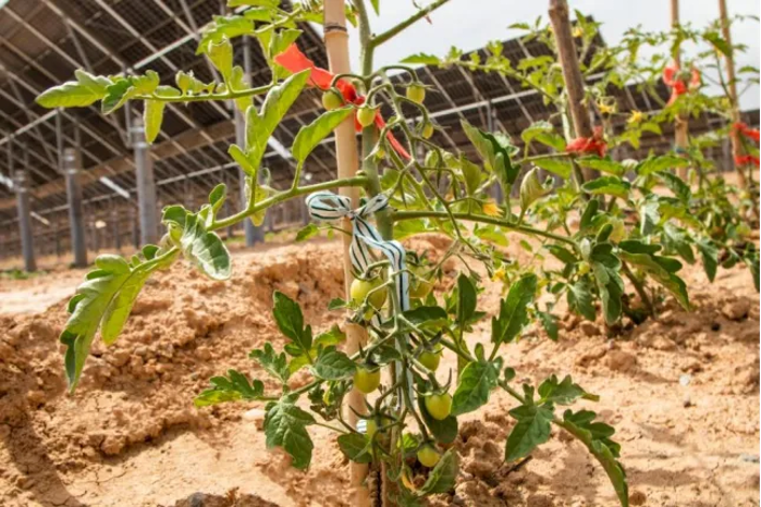 “农光互补”区里,在红泥全覆盖的沙地上,试验种植的西红柿已经结出青色的果子,黄瓜、西瓜、马铃薯、辣椒、茄子长势喜人。