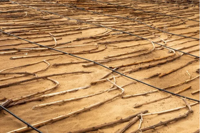 库布其沙漠以流动、半流动沙丘为主,风蚀严重。“长久治理沙漠,首先要用沙障把流沙固定住,达到风吹但沙不起的效果。”三峡上海院生态工程设计研究院工程师高建文介绍。