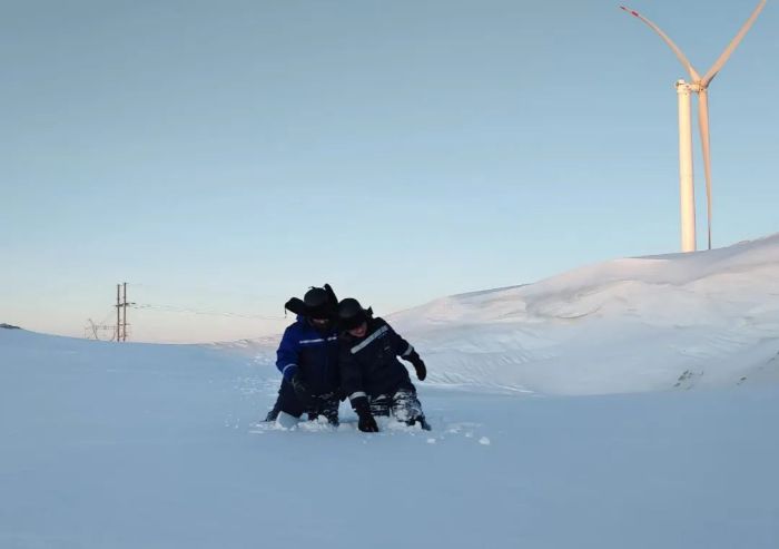▲ 三峡能源新疆布尔津风电场员工踏雪巡检