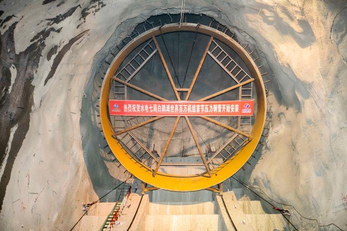 本网讯(杜健伟 赵爽)11月30日,白鹤滩水电站世界首台百万机组首节压力钢管安装开工仪式在左岸压力钢管下平段2号施工支洞举行。经过近2个月精心准备,左岸首节压力钢管已安全运转到位,厂房引水隧洞将由土建开挖阶段转入金属结构安装阶段。