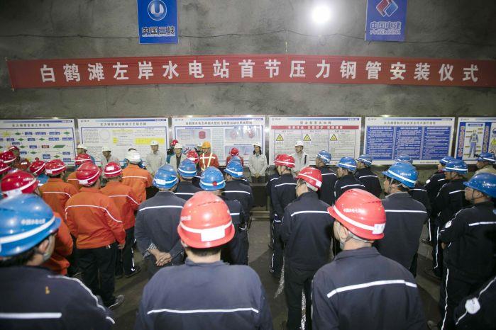 开工仪式上,水电七局白鹤滩施工局和三峡发展公司白鹤滩监理部相关负责人汇报了首节压力钢管安装前的准备和检查情况。水电七局领导带领安装区全体职工庄严承诺,在压力钢管安装施工中,始终坚持“生命至上、安全第一”的理念,牢固树立“千年大计、质量为先”的意识,以施工区大党建为平台,发挥党员先锋模范作用,攻坚克难、争先创优,为百万机组安装奠定坚实基础,为白鹤滩水电站打造金结安装样板工程。