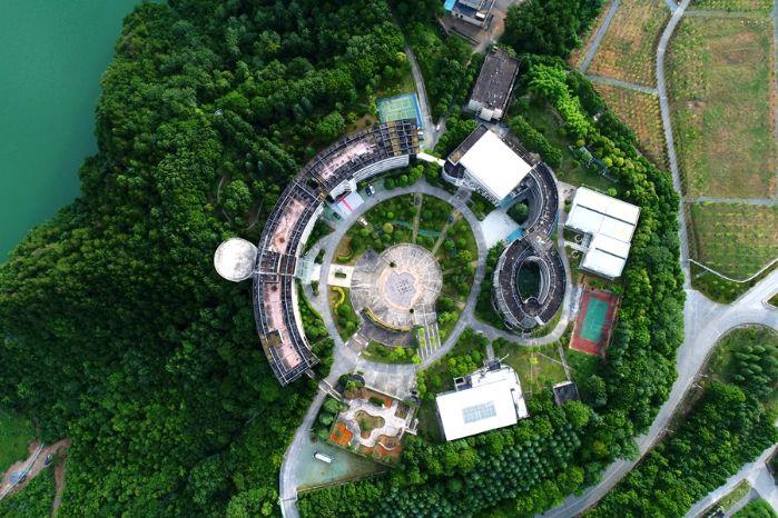 水布垭电厂生活区汤家包是从清江河道左岸边密实丛林的一个山头开挖平整出来的一个平台,如今从空中俯瞰下去,恰似安放在清江边上一块磨刀石。