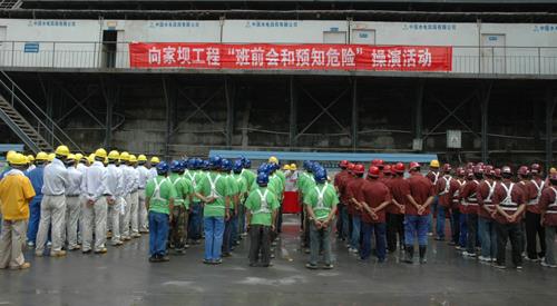 | 6月17日,向家坝工地举行安全班前会和预知危险操演。(孙保建 摄) |