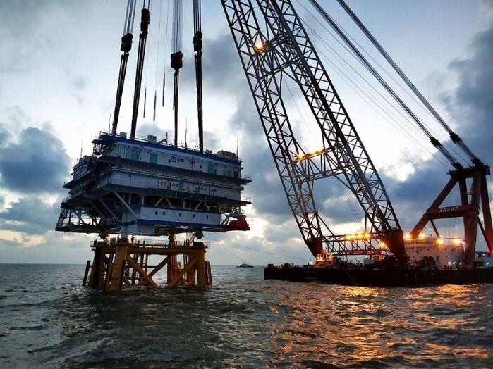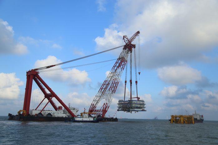 江苏大丰项目位于江苏省盐城市大丰区东沙沙洲北侧的小北槽—太平沙海域。项目海上升压站成功吊装是继5月30日全面进入风机吊装阶段之后又一里程碑式节点。其海上升压站整体结构布局及区域功能设计合理,技术先进,并首次实现了电气一次主设备完全国产化。